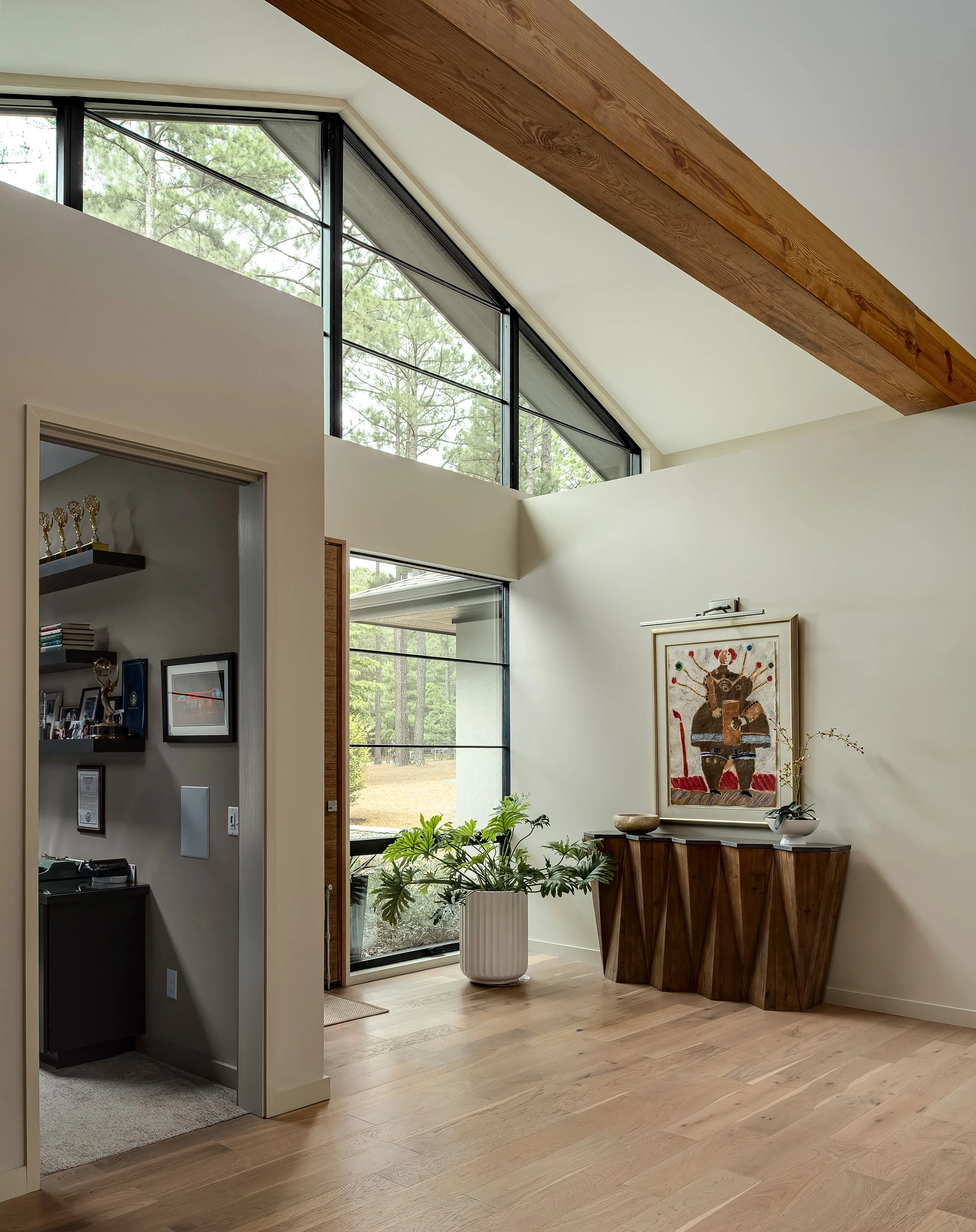 A three-bedroom retirement home for an Emmy Award–winning journalist relocating from California, featuring an integrated collector’s automobile storage.